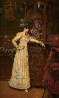 Dans un décor riche de tonalités sombres et sophistiquées, la robe jaune de cette jeune femme élégamment chapeautée apparait comme un rayon de soleil. Négligemment accoudée à une commode, elle contemple une sculpture qui semble l’interroger. A gauche de la composition se devinent des fleurs, métaphore visuelle à Baudelaire et à ses Fleurs du mal. Le peintre a dessiné une ombrelle, précieux accessoire que toute femme de son temps se doit de posséder. On l’espère « de la même nuance que l’effeuillaison des pétales de sa robe »… (Marcel Proust)