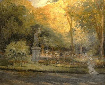 Par un bel après-midi d’été, une femme lit à l’ombre de grands arbres, indifférente à l’imposante sculpture scellée sur un socle. Le pinceau de l’artiste brosse à large traits les feuillages traités en camaïeux de vert, qui enveloppent la silhouette dans une douce harmonie. Au loin, des personnages de blancs vêtus que l’on imagine installés sur des chaises apportent un peu de mouvement à cette scène bucolique et sereine.