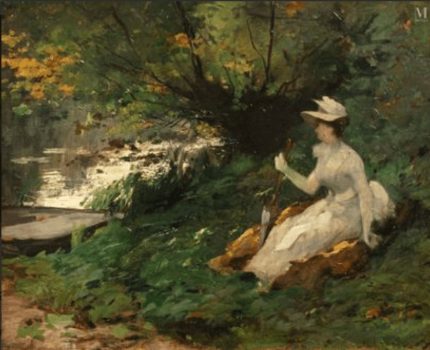 La scène est charmante, la composition parfaite. Assise au bord de la rivière, sans doute le Loing –l’artiste vécut et travailla de longues années à Grez-sur-Loing–, une femme chapeautée et gantée rêve. Une touche souple, des ombres ajustées, des jeux de lumière filtrant à travers les feuillages, une scène en pleine nature : l’artiste fait bien ici œuvre impressionniste. Sur la gauche de la toile se devine une barque, comme une invitation au voyage.