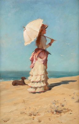Soleil d’après-midi, vaste ciel bleu, immensité marine : la palette est lumineuse, la touche annonce l’impressionnisme. Entre le sable et la mer, la fine jeune fille qui se promenait sur la plage, fait une pose, son chien couché à ses pieds. Elle ferme les yeux, respire l’air marin. A quoi pense-t-elle ? Au loin une voile et des mouettes. Dans La Recherche, les mouettes sont des métaphores des jeunes filles en fleurs se promenant sur la plage.