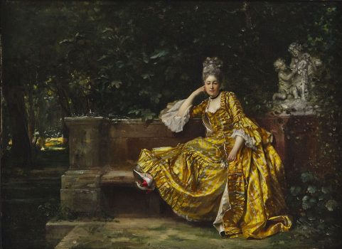 Retirée sous les frondaisons, les yeux baissés, une rose à la main, cette élégante se laisse aller à quelques rêveries mélancoliques, sous l’œil indifférent de deux angelots en pierre qui batifolent. Si sa mise relève d’un autre temps, il n’en est rien de la pose. Le peintre s’amuse en installant la belle dans une posture peu conventionnelle, pieds relevés sur le banc, dans de pimpants souliers à talons rouges et une robe en soie chatoyante et dorée. Au loin, on entend les murmures de la fête…