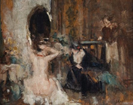 Une femme dénudée s’installe devant son miroir. Elle refait son chignon tout en conversant avec ce qui semble être une vieille femme assise à sa droite, vraisemblablement sa dame de confiance. On ne peut s’empêcher ainsi de songer à Nana…