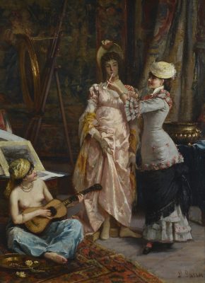 La scène intrigue. L’artiste a pris comme sujet d’inspiration, son assistante préparant un modèle pour la pose. L’assistante fixe délicatement une pipe dans la bouche du modèle qui, bizarrement, semble se laisser faire, le regard absent et le teint blafard. Une étrange coupure se devine au niveau du cou. Tout s’éclaire ! C’est un mannequin articulé, préparé pour une pose future, avec un modèle vivant cette fois…