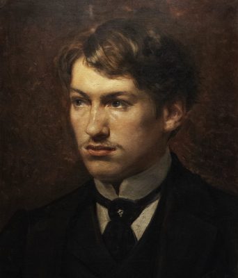 Ce portrait original de Marcel Proust, réalisé à la toute fin du XIXème siècle, nous propose une vision sobre et raffinée de l’auteur de La Recherche. Elève et disciple du peintre symboliste Gustave Moreau, Jacques Aymer de la Chevalerie reprend ici des codes réalistes, associés au souvenir symboliste de son maître, pour livrer une œuvre sans fard, pourtant dotée d’une élégance indéniable. Proust y garde ses cernes, marqués sans timidité sous l’éclair d’un œil vif, fixant le spectateur. L’ajout de bagues, non observées sur les photographies connues de l’auteur, apporte une note fantaisiste, définissant parfaitement l’ambiance fin de siècle à laquelle Marcel Proust appartient, chargée de douce désinvolture et de mélancolie radieuse.