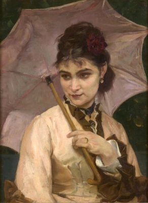 A rosewood outfit contrasts with dark eyes and a barely sketched smile, imparting mysterious charm to this young woman. Everything about her attire is subtle: the crimson rose tucked in her hair, the delicate gem set on a black velvet ribbon, her dainty earrings, and, unusual for the time, a ring adorning her wedding finger. Reflecting her diaphanous milky complexion rather than a mere accessory, her parasol is a symbol of a type of elegance that reached its peak in the Second French Empire.