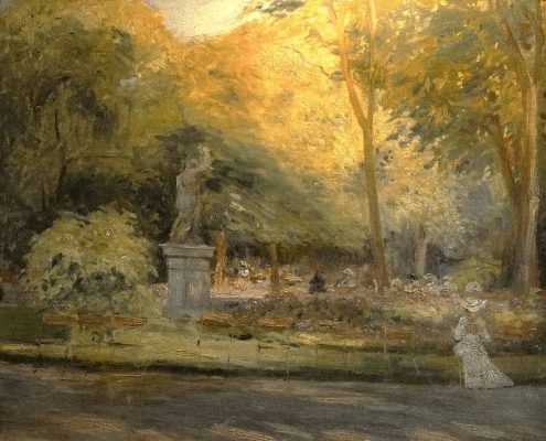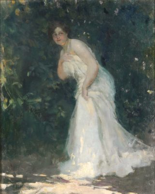 From which secret boudoir has this full-figured, young woman slipped out? Summer sultriness is here. Framing his subject in a curtain of greenery, the artist has delicately captured the heat of the sun as it pierces through dark foliage. Holding back her white dress with one hand, the coquette appears to be suspended time, subtly hinting at love notes, tender moments, and stolen kisses. Embracing the voluptuousness of life, Parisian women were more than ever seen as unchaste at the turn of the century.
