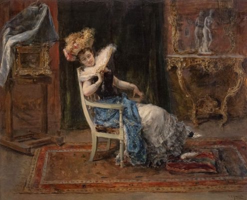 Tucked behind foliage, eyes downcast as she holds a rose, an elegant lady indulges in melancholic daydreams, under the indifferent gaze of two frolicking stone cherubs. Although her attire suggests other times, her pose is anything but this. Here, the painter has playfully placed his beautiful model in an unconventional position: an elegant high-heeled red shoe rests on the bench beneath a gown of shimmering gold silk. We can almost hear murmurs of a party in the distance.