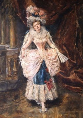 Loving the theatre justified endless parading in exquisite evening gowns: with the First French Empire, times had turned to simplicity, removing crinolines and hoop skirts which were so hard to fit into Louis Vuitton cases. For this full-length portrait, the woman is clothed in a sumptuous pink taffeta and white gossamer gown adorned with delicate lace.