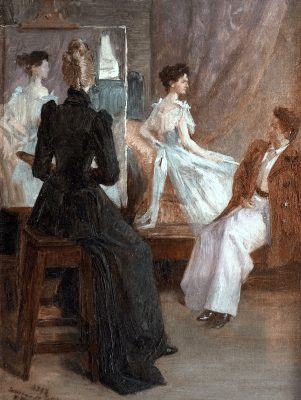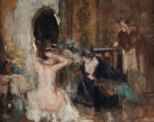 A naked woman sits before a mirror. She is doing up her bun as she chats to a seemingly old lady on her left, most likely her confidante. We cannot help but think of Zola’s character Nana.