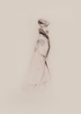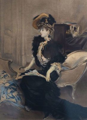 This aquatint celebrates the painter’s virtuosity and his incredible capacity to capture movement and grace in bold, sinuous, smooth brushstrokes. Here, Giovanni Boldini has captured an elegant woman deep in conversation. The artist, a passionate music lover, has sketched an upright piano behind her.