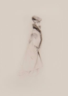 She is taking one small step at a time, warmly wrapped up in a sable collar coat. Is this elegant woman having as much pleasure when looking at as when she is being looked at?