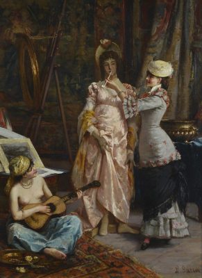 Teasing his painter friend who immortalised the elegant women of the Second French Empire, Émile Zola spoke of “Toulmouche’s delightful dolls.” With her long silken gown, her gloves and lace shawl casually thrown on an armchair to better pluck the note that has been tucked into her bouquet of roses, this striking brunette must surely be in love. Indeed, who would a Parisian be without love?