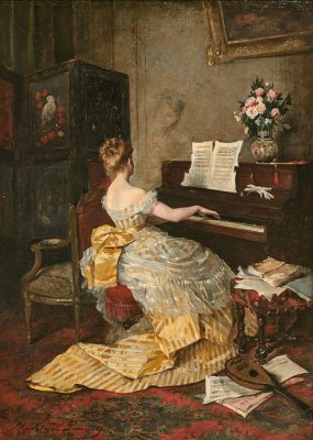 Although honourable, Madeleine Lemaire’s talent has all too often been reduced to an appreciation for roses. With its masterful composition and colour scheme, this genre painting proves the point. A disturbing detail is the faintly sketched face of a smiling woman which seems to look down at her from the wall. Does it express the artist’s remorse, or her wish to illustrate the pianist’s daydreaming?